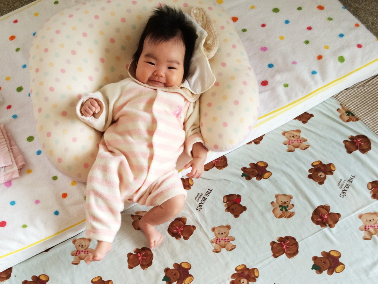 床掃除のために物をどかしていたら香桜ちゃんが敷布団からずり落ちて楽しそうにこっちを見ていた。おーい、片足出てるよー。この後さらに布団から落ちて最終的には泣きました。あと1週間で3か月になります。
