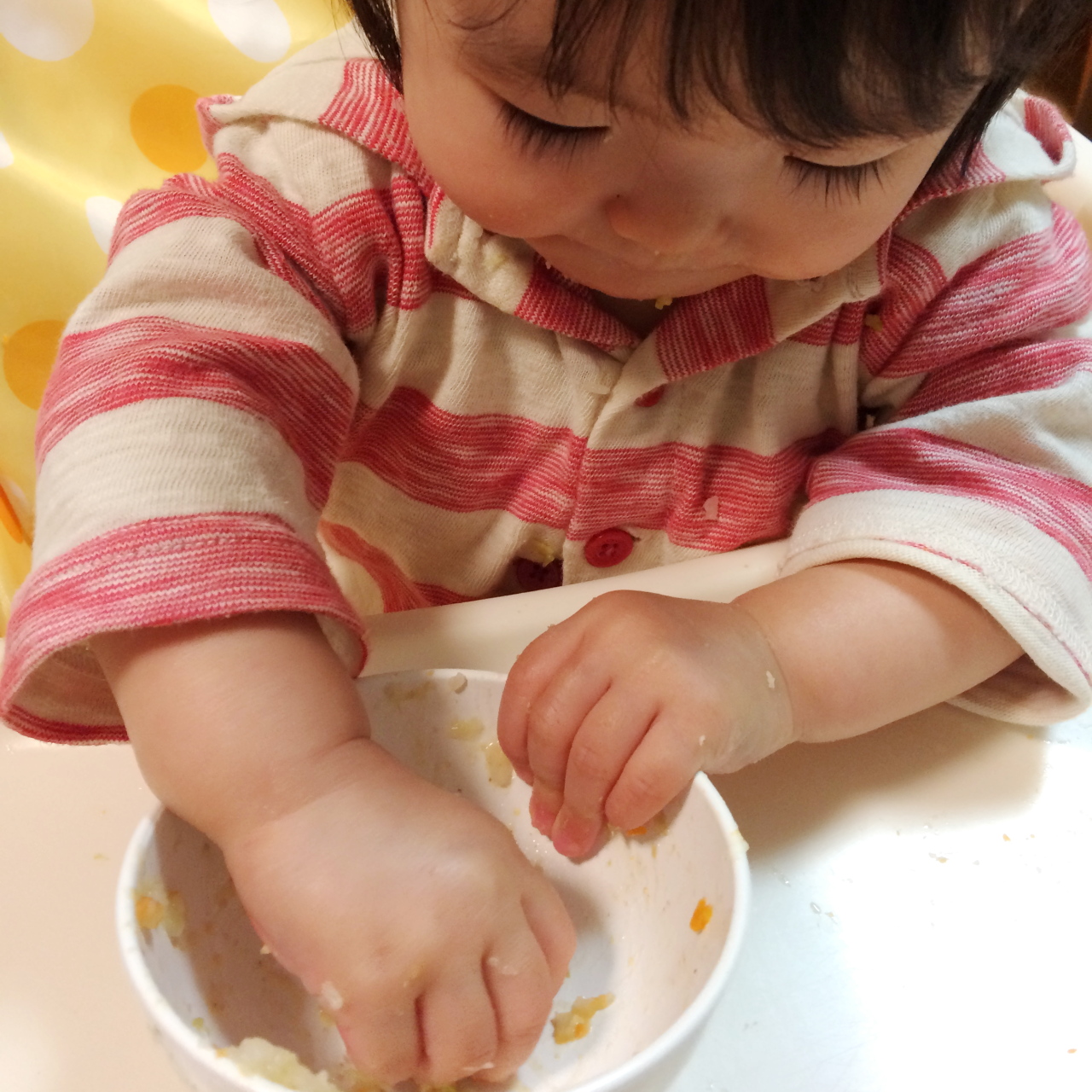 そして本日。食べ終わったところで目を離したすきに茶碗を奪われ、例のグッチャグッチャが始まってしまった。少しは楽しませてやるかと見守っていたら、なんと自分でご飯をつかんで口に運ぶじゃありませんか! まだ上手じゃないけど手で食べてる! お菓子じゃないご飯でそれをやるのは初めてでした。