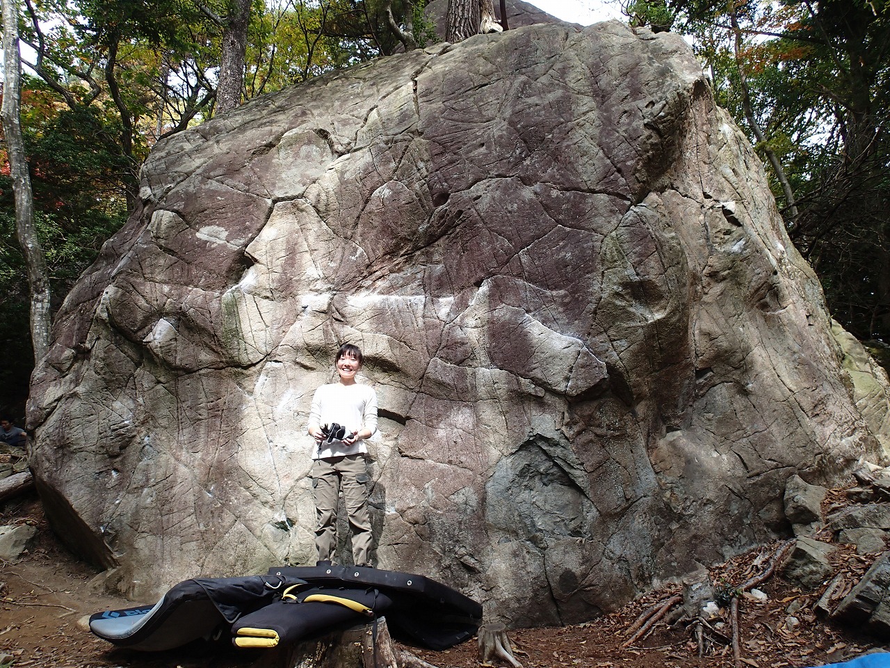 岐阜の一大ボルダリングエリア、笠置山 笠置山に初めて行きました(@^^@)ノ ひゃー、でっかい岩が多くて、すごい! これ登りたい!って誰しも思うようなかっこいいラインもいっぱい。親切な案内板など、ソフト・ハード両面で充実の笠置。大事にされていってほしいな! 写真はカタール(7級)登って満足気な私。高くて怖かったっす…一皮むけた!?