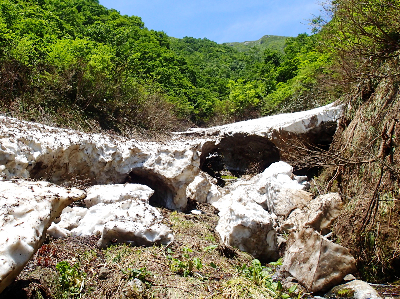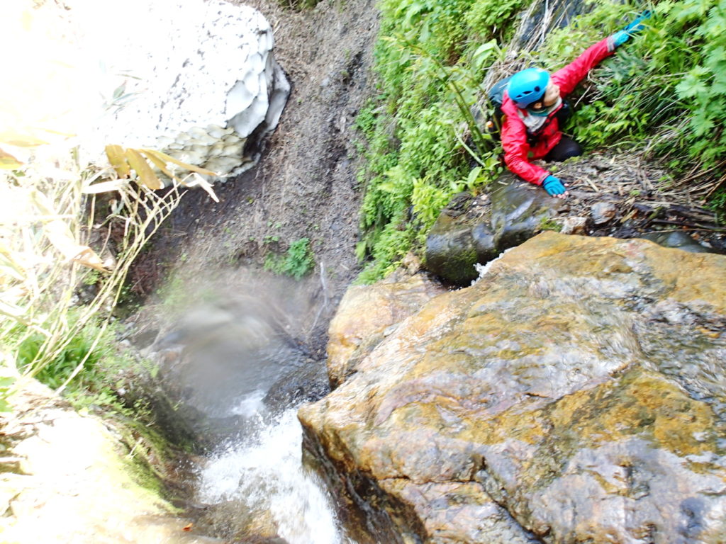 すでに予定時間はオーバー。なかなか源頭の穏やかな風景にならない。ダメ押しの2連爆をガタガタ震えながら女子2人でそれぞれトップを代わり、登る。最後は100mほど雪渓を詰めるとようやく水も雪も切れた。距離的にはほんの3キロの沢の中に、6時間ほど滞在したことになる。