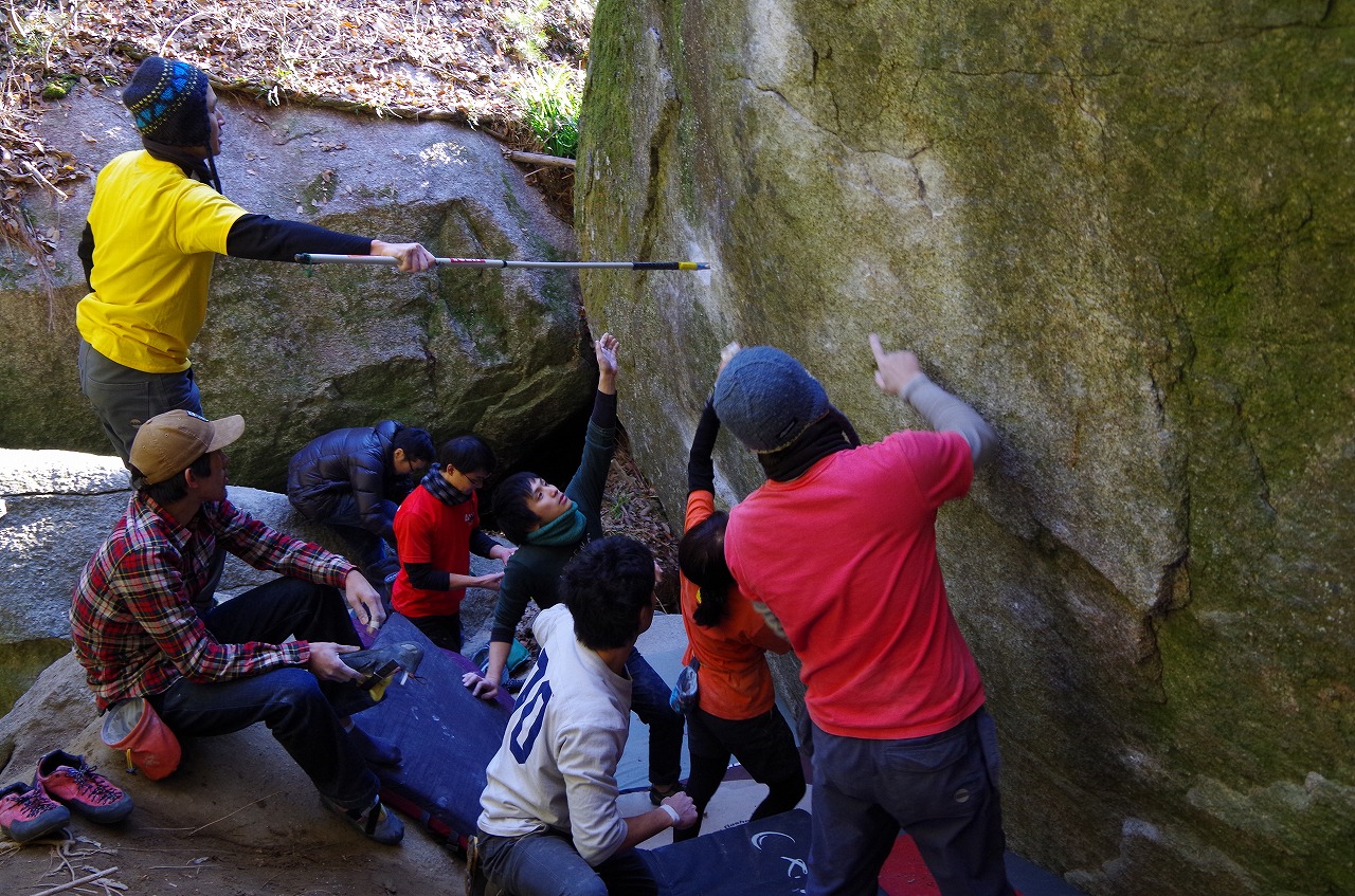 クライミング仲間の輪 今日の楽しそうな1枚! 豊田・古美山の蛇の目(e)に集まってあーだこーだとやっている大人たちの図。w 楽しそうです! 私はリーチ(b)が二撃できてやったね。夫も一難去って(d)を落とせて満足げ。クライミング仲間の輪が広がっていい感じの冬の日でした^^