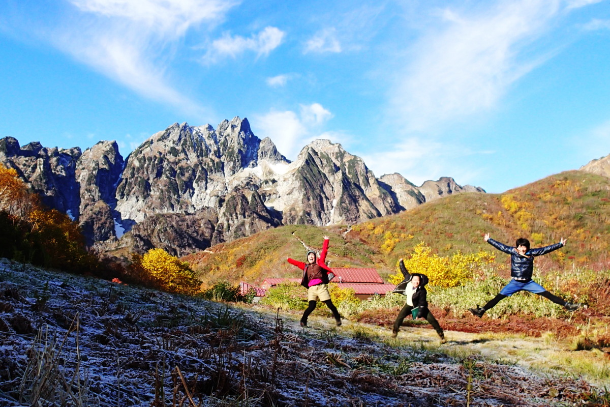 台風18号は雪を降らせていて、剱御前からいきなり雪道を下ったり、標高2400mで氷点下の雪上テント泊、アイゼンでの雪渓歩き、仙人谷では足をすべらせたり転びそうになったりひやひやして、長い梯子に疲れて。でも山を白く化粧させた雪は思いがけないプレゼントだったし、中腹の紅葉がまた素晴らしいものだった! 天気の安定が続いたことは、私たちにとって何よりの幸運だった。