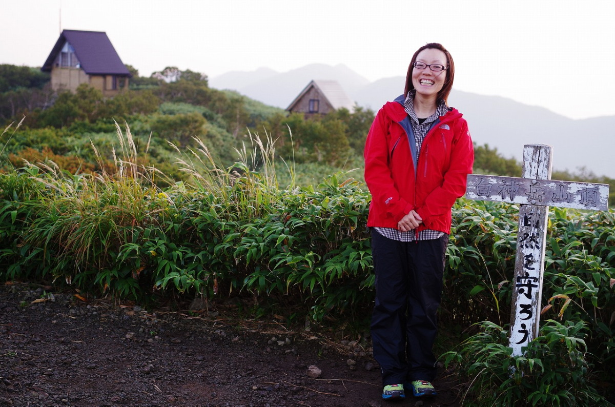 ―6日目(最終)、白神の旅で最後に泊まったのは避難小屋!(写真の後方がそれ) 起きたのは4時45分。薄雲が出ていて岩木山は見られない。それでも30分ほど山頂でご来光を楽しんだ。昨晩、小屋には男女3人パーティの先客がいて、話をするとこの地域のエアリア(山と高原地図)の著者だった。コースタイムの踏査に来たそうだ。