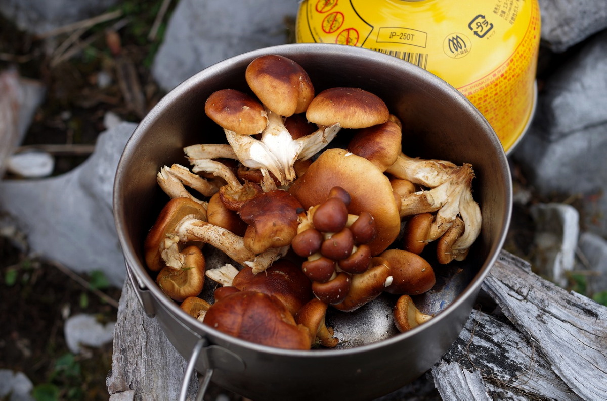 さらに標高を上げると、再び見たことのあるきのこが。今落ち着いて見ると明らかに沢で採れるなめこだけど、その時は乾燥なめこを知ったあとだったので「さっきのと違う! じゃあ何だろう?」。気になるから袋を分けて収穫しました。帰って調べるためです【写真中】。