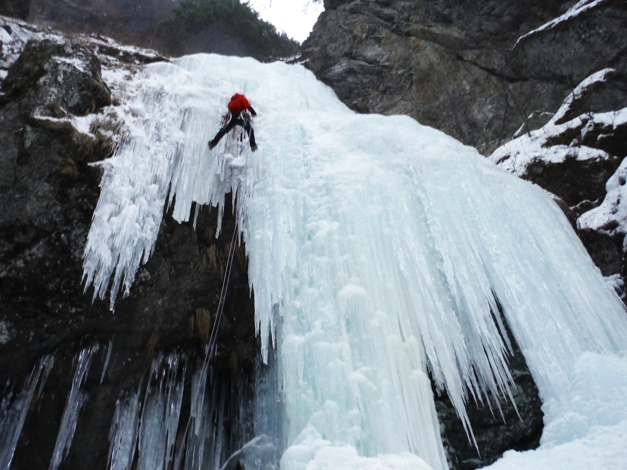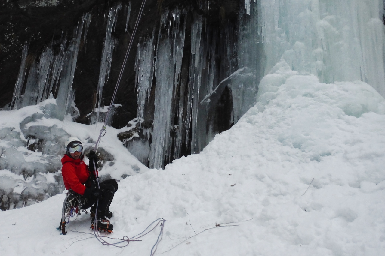 それと先月までに登った6日間の氷瀑たちでの経験を思い返すと、自分はこれくらいのことができそうだと感じるものがあった。手となるアイスバイルと足となる縦爪アイゼンの感覚も馴染み、できる範囲が分かって、その範囲内には自信がついた。だからアイスで初めてリードに挑戦してみた。しっかり安定して登れた。「そうか、こういう感覚なんだ」。まさに登り込んだ成果! 昨冬はめずらしく外岩に打ち込んでいたけど、通えば通うほど強くなっている感覚が楽しかったのと同じ。
